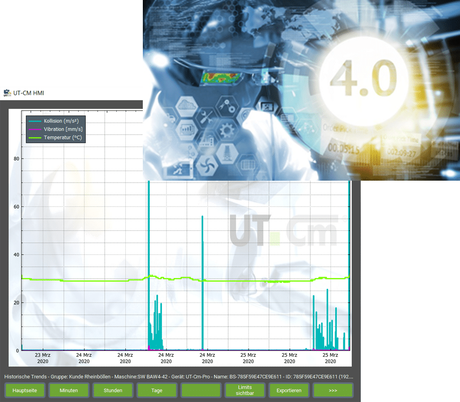 Avec le capteur UT-Cm®, vous pouvez facilement mettre en œuvre une surveillance innovante d’une ligne de production locale comme à distance, grâce à l’intégration de notre logiciel SAM (Smart Asset Monitoring). Son intégration au service de maintenance vous permet de visualiser dans un seul tableau de bord l’ensemble des systèmes connectés ainsi que les états des machines, de réaliser des ICP (Indicateur Clé de Performance), l’enregistrement des événements d’alarme et des collisions en temps réel, les vibrations, gestion des profils d’utilisateur et planification de la maintenance préventive.